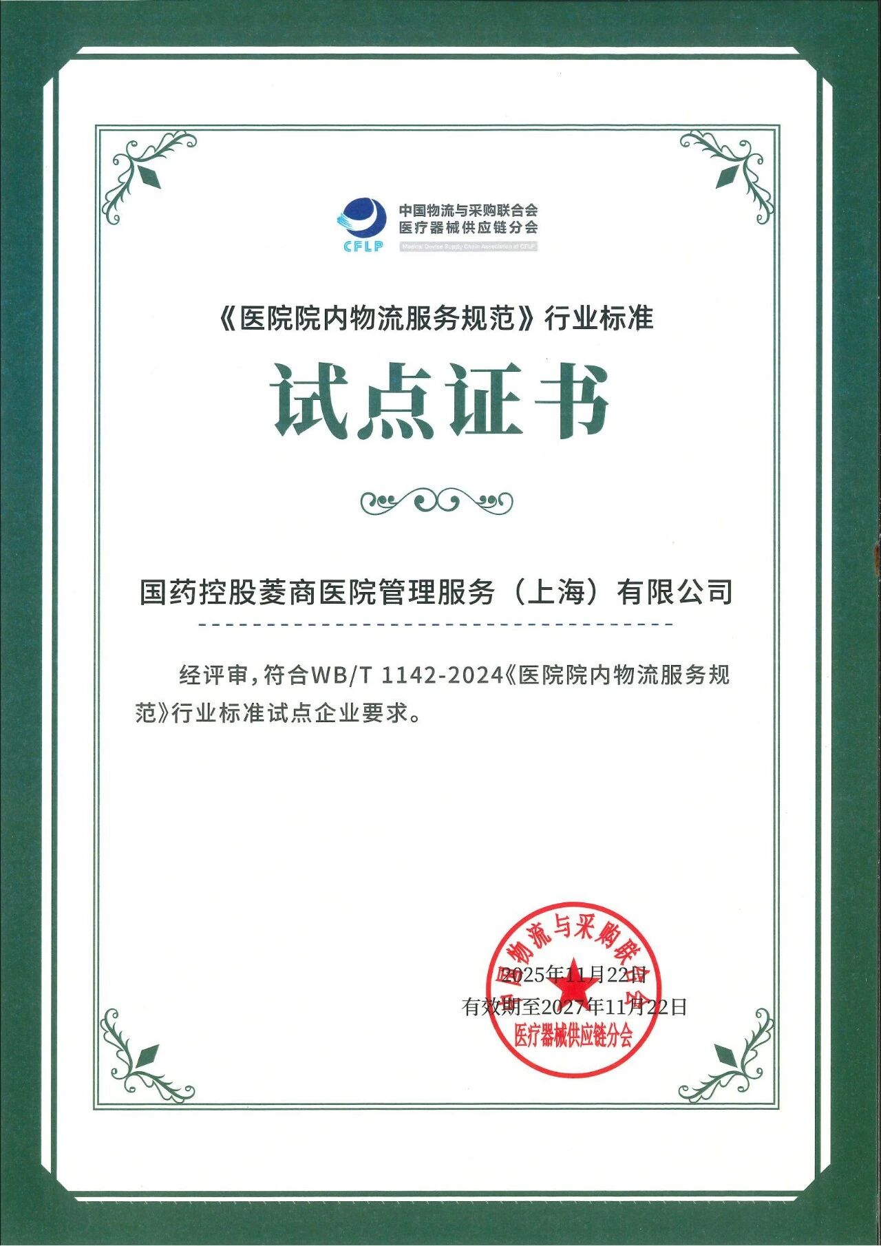 国控菱商在行业标准化建设方面取得主要突破,,,,,获得三项权威认证:牵头起草并宣布T/CFLP 0078-2025《医院院内医疗器械物流效劳质量评价》整体标准,,,,,获得整体标准起草单位证书;;;;;;加入T/CFLP 0079-2025《骨科耗材物流效劳规范》整体标准的制订事情,,,,,获得整体标准起草单位证书。。。。。